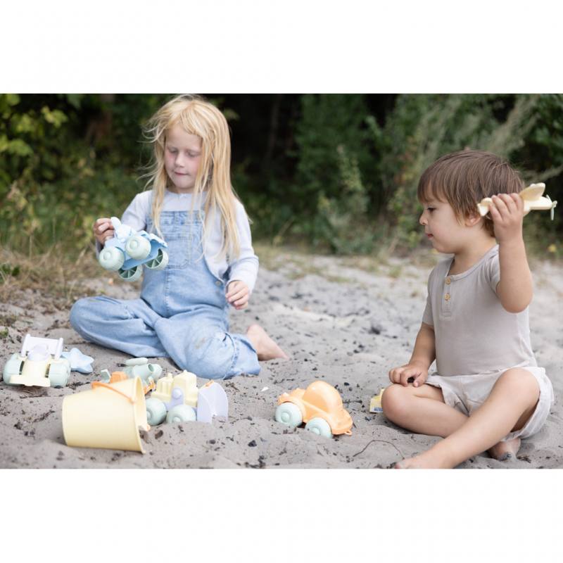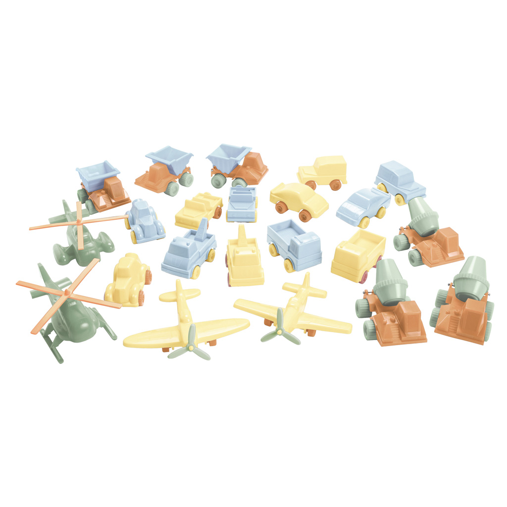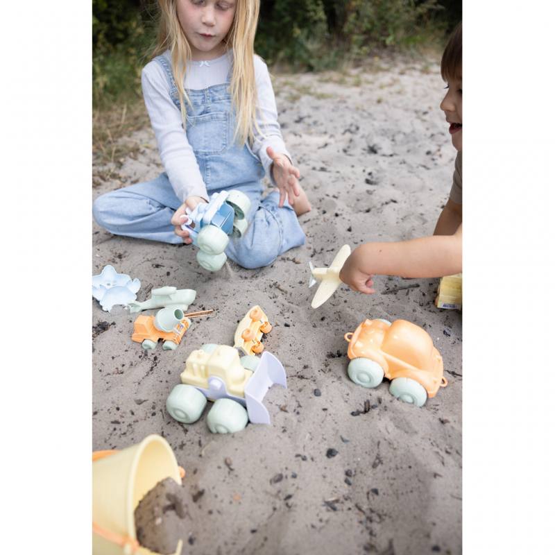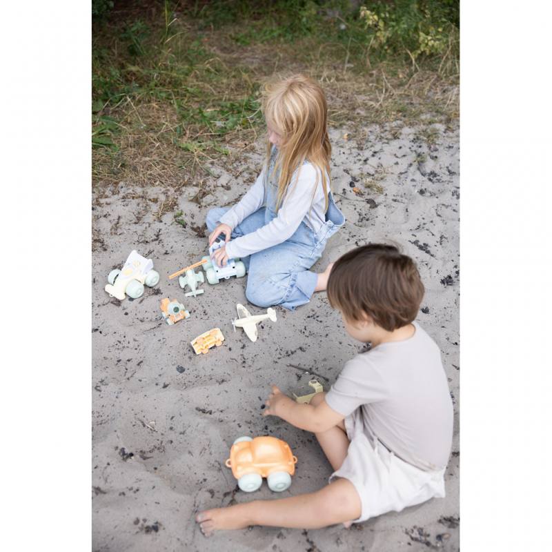Die Autos und Flugzeuge sind aus recyceltem Kunststoff gefertigt und tragen das renommierte Nordic Swan Ecolabel. Die abgerundeten Formen und die angenehme Haptik machen das Spielzeug ideal für kleine Hände, während die Bewegung von Rollen und Propellern die Feinmotorik und Hand-Auge-Koordination fördert.