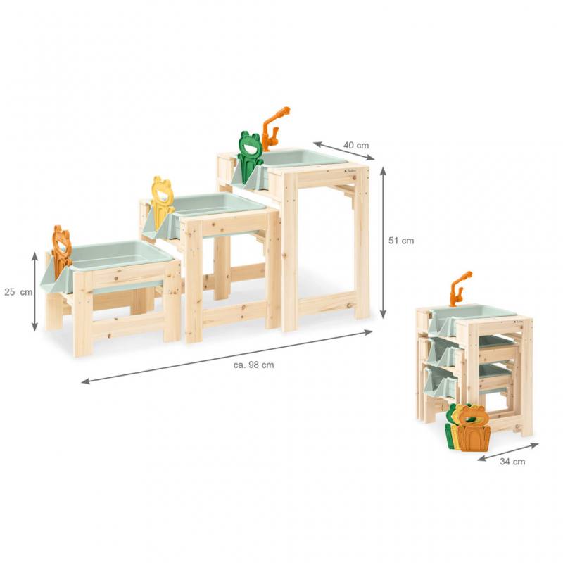 Der Wasserspieltisch 'Frolino' bietet Kindern ein vielseitiges und naturnahes Spielerlebnis im Außenbereich. Das 3-teilige Set besteht aus hochwertigem, unbehandeltem Nadelholz und fügt sich durch die vollmassive Bauweise harmonisch in jeden Garten oder Außenbereich von Kindergärten ein. Die drei Spieltische verfügen über unterschiedliche Höhen, wodurch ein natürliches Gefälle entsteht, das Kinder dazu einlädt, die physikalischen Eigenschaften von fließendem Wasser spielerisch zu erkunden.