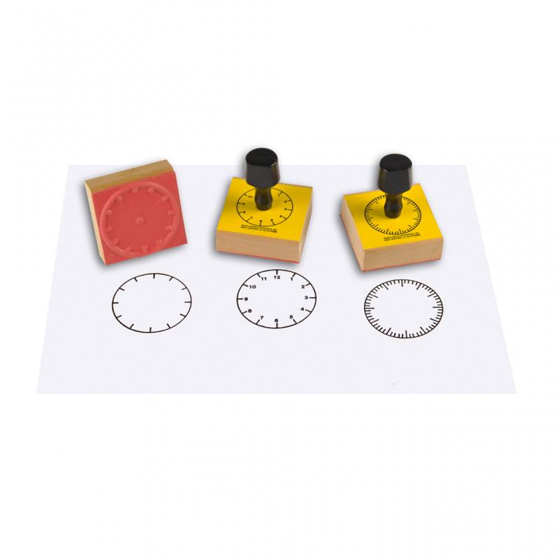 Jeder dieser Uhrenstempel hat ein anderes Zifferblatt.