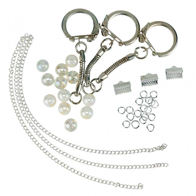 - Inhalt: 2 bedruckte Schrumpffolien, 3 Schlüsselringe und Verschlüsse, 3 Ketten und 9 Anhänger, 12 farbige Perlen, 6 farbige Satin-Bänder