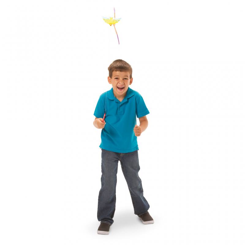 Nach dem Gestalten geht es nach draußen: Einfach die mitgelieferte Schnur und die Handstäbe anbringen – und schon tanzen die bunten Vögel im Wind! So wird nicht nur die Kreativität gefördert, sondern auch ein erstes Verständnis für Physik, Wetter und Aerodynamik geweckt.