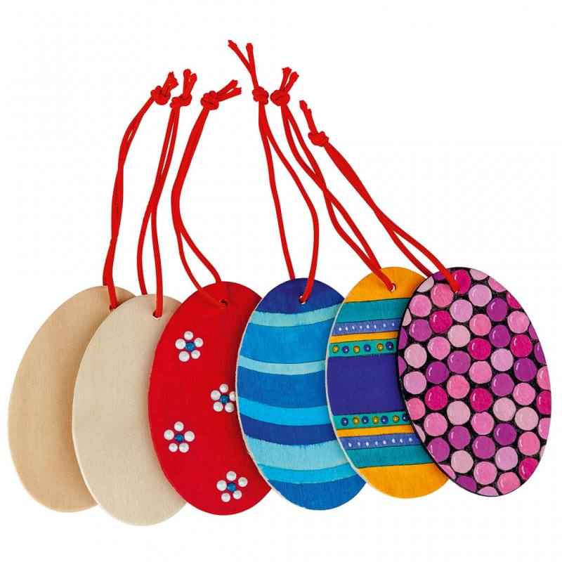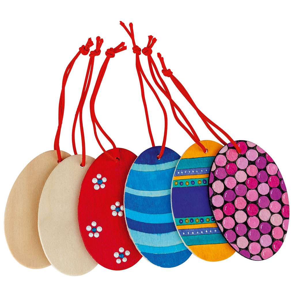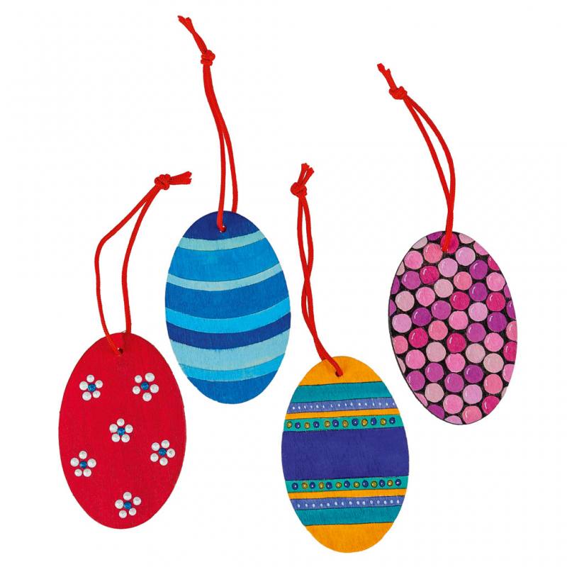 Die fertig ausgesägten Ostereier müssen nur noch farbenfroh mit Farbe, Stoff, Bändern oder Federn verziert werden. Dann können Sie Fenster, Geschenke oder den Osterstrauß damit dekorieren.