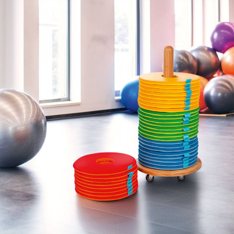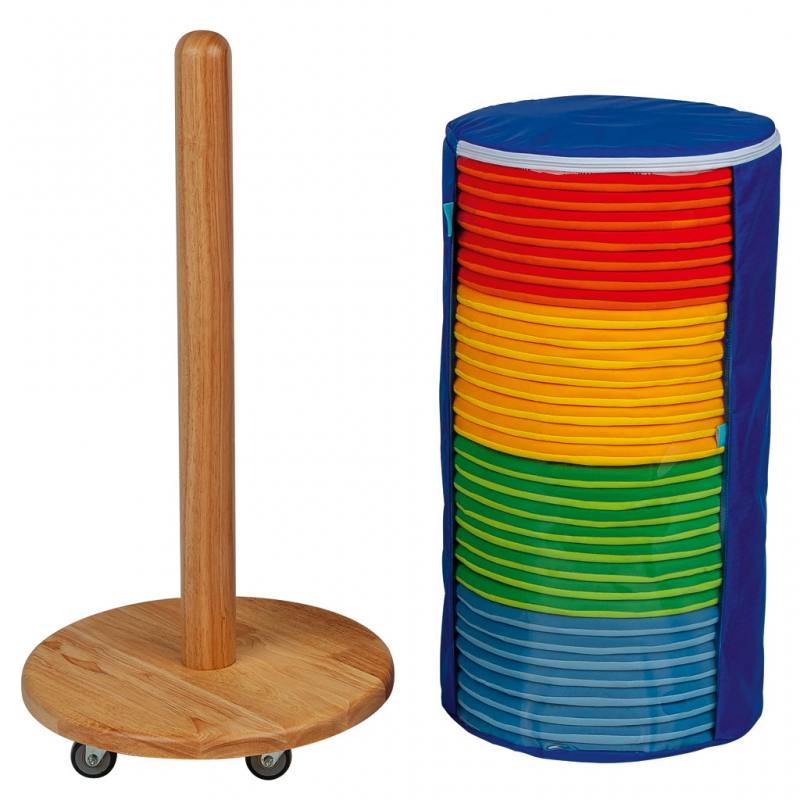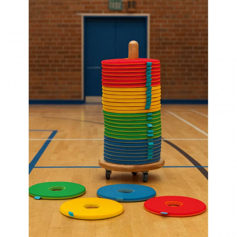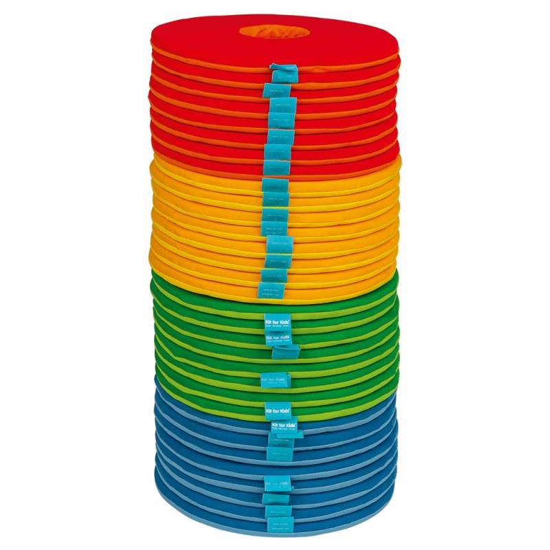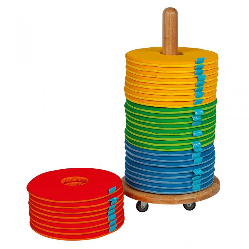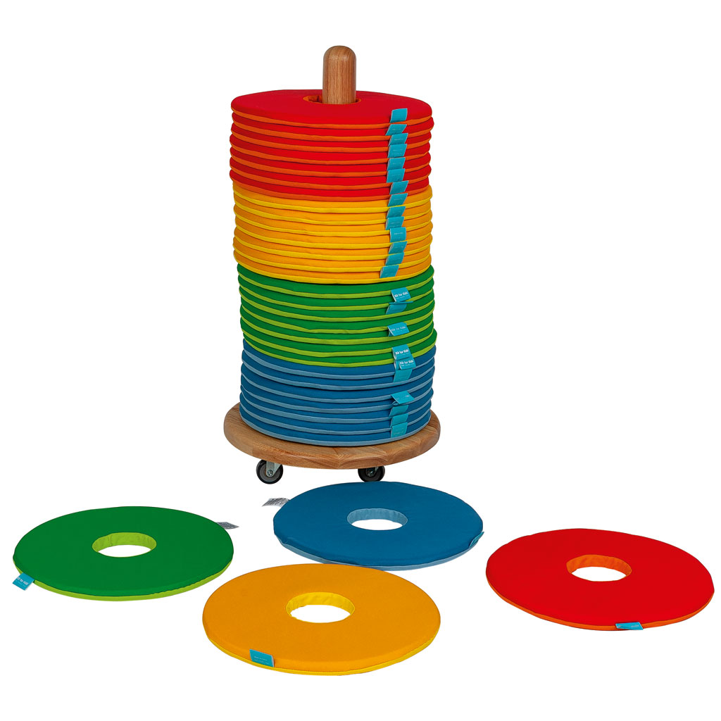Das Set enthält 32 runde Donut-Kissen mit etwa 35 cm Durchmesser. Die leuchtenden Farben machen sie bei den Kindern besonders beliebt und fördern spielerisch Ordnungssinn und Eigenständigkeit. Mit dem Kissenwagen schaffen Sie eine entspannte, fröhliche Atmosphäre, in der Kinder sitzen, spielen und gemeinsam lernen können.