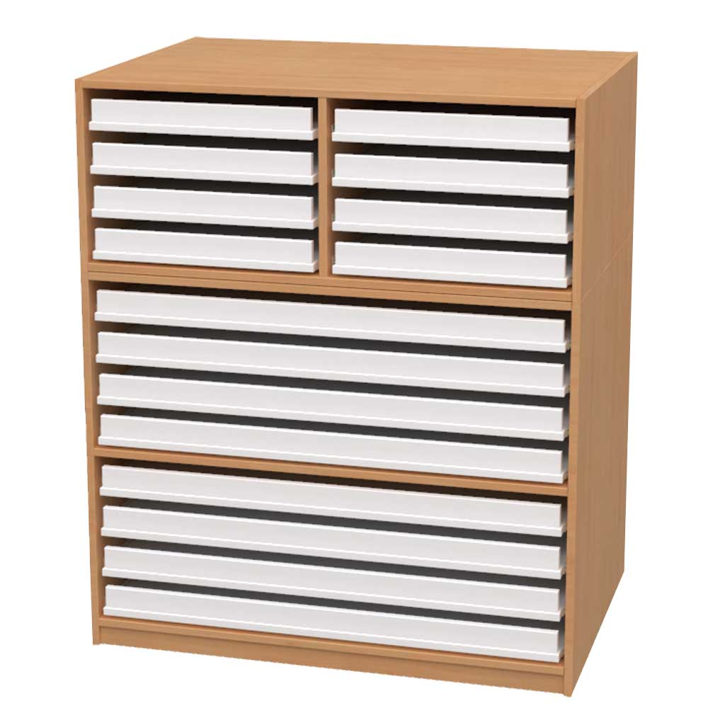 Die Schubladen sorgen für Ordnung und bieten eine preiswerte und flexible Lösung für Tonpapier, Wellpappe, Zeichenkarton und andere Bastelpapiere bis zu einem Format von 100 x 70 cm große Schubladen und bis zu einem Format von 50 x 70 cm kleine Schubfächer.