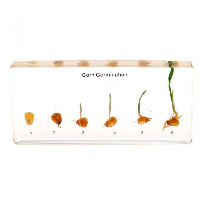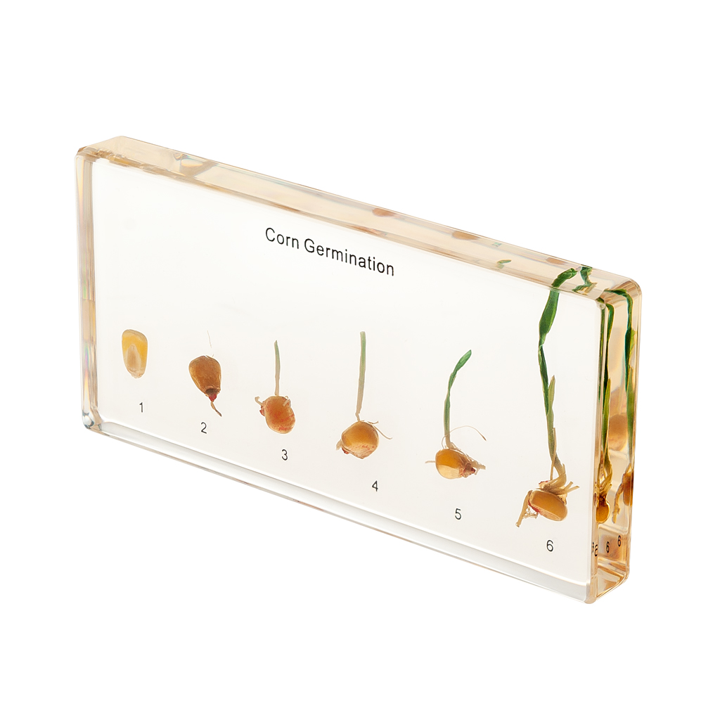 Entdecken Sie den faszinierenden Prozess der Mais-Keimung mit unserem hochwertigen Kunstglasblock. Dieses anschauliche Lehrmittel zeigt die sechs Stadien der Mais-Keimung, von der Aussaat bis zur Pflanze.