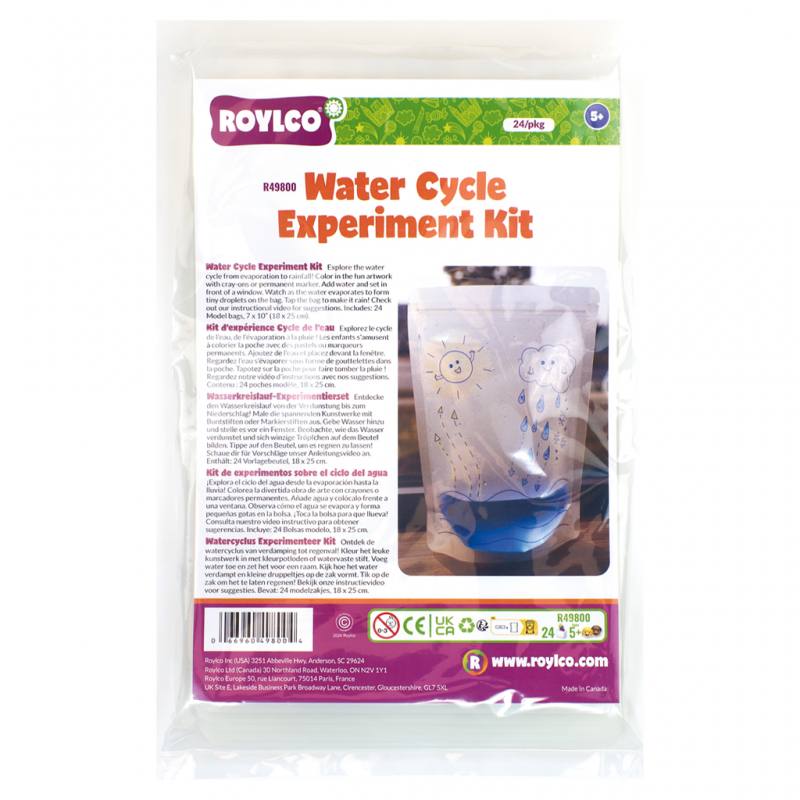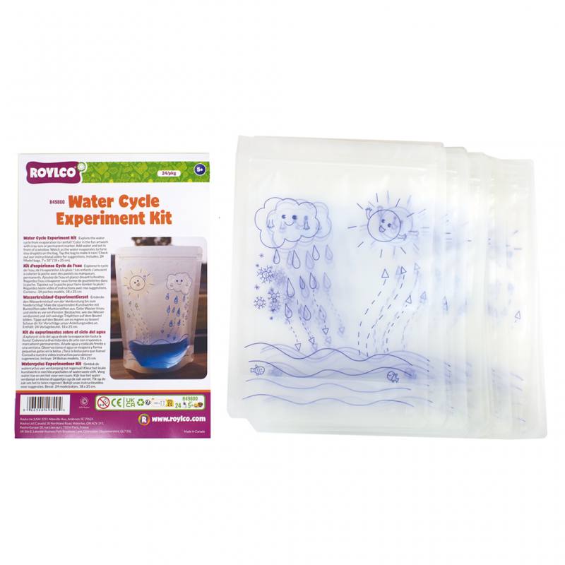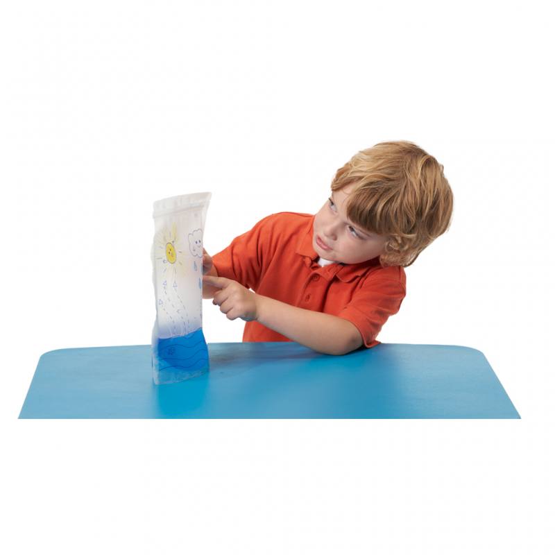Mit dem anschaulichen Experimentierset erleben Kinder den Wasserkreislauf hautnah. Die 24 Sets enthalten bedruckte Kunststofftüten mit Standfläche und praktischem Zip-Verschluss, die mit Wasser befüllt und individuell gestaltet werden können. Durch das Platzieren am Fenster wird der natürliche Kreislauf von Verdunstung, Kondensation und Niederschlag auf einfache Weise sichtbar.