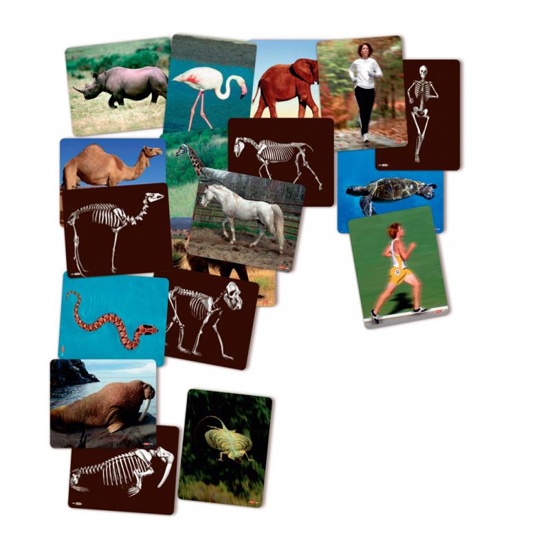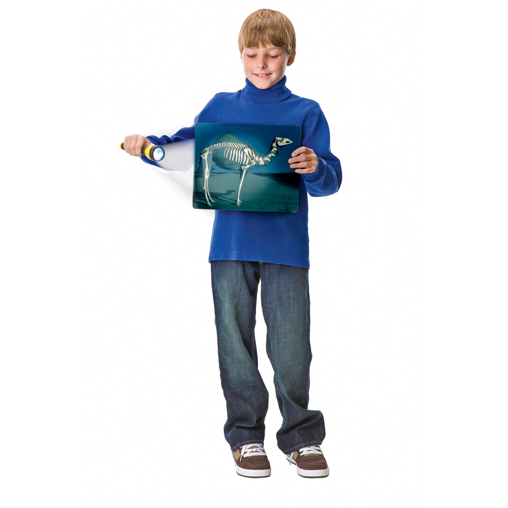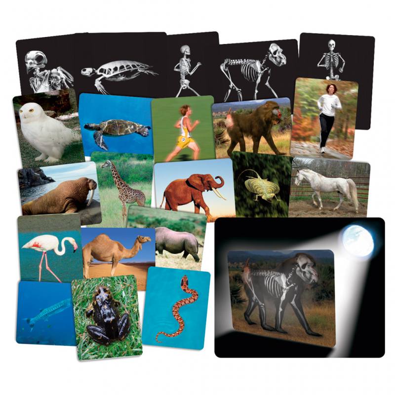 Mit dem faszinierenden Set entdecken Kinder das Innenleben von Tieren und Menschen auf besonders anschauliche Weise. Die 16 großformatigen Bildkarten zeigen auf der Vorderseite detailreiche Fotos verschiedener Tiere – darunter auch zwei menschliche Darstellungen – und offenbaren beim Anleuchten mithilfe von Lichtquellen die darunterliegende Knochenstruktur in Röntgenoptik.