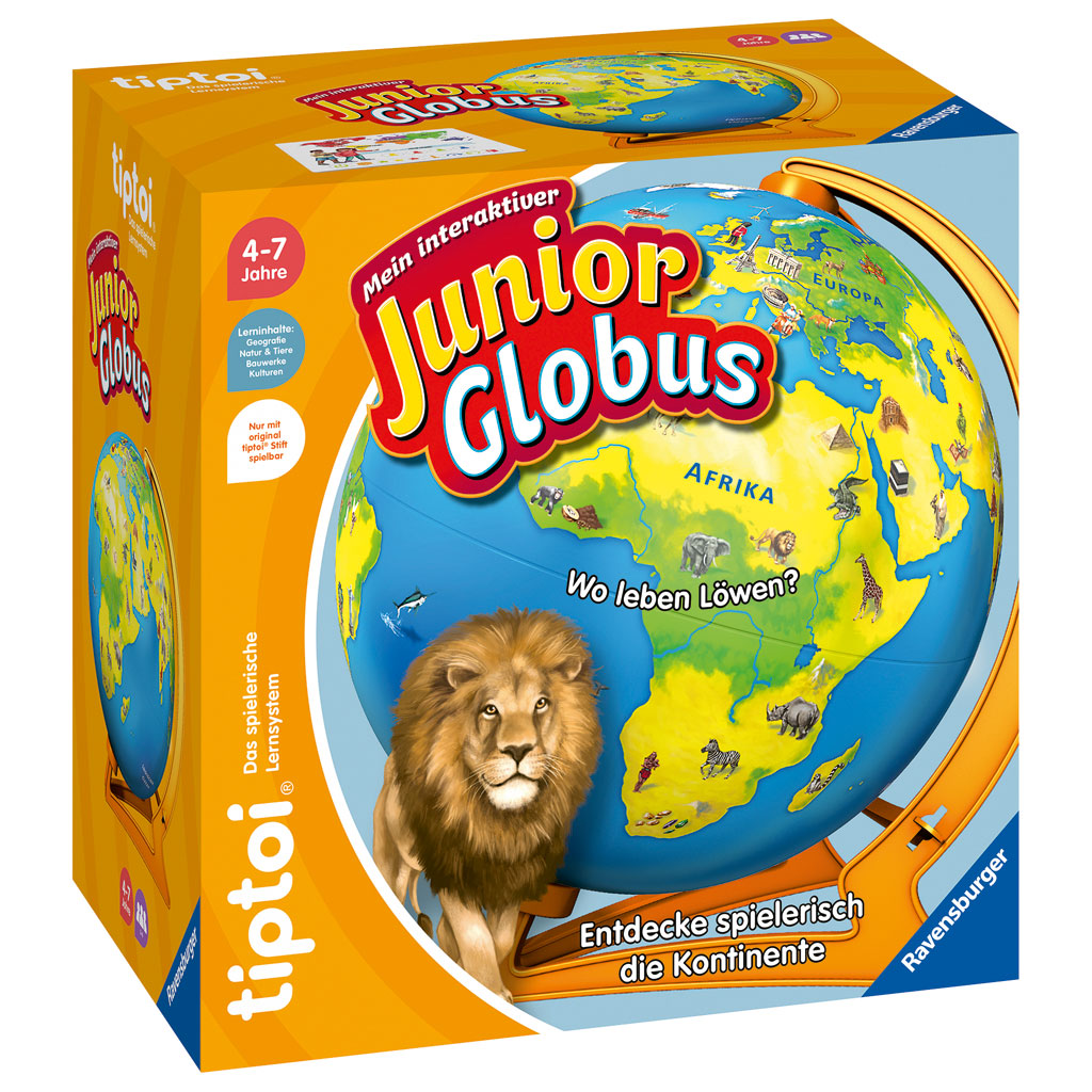 Der tiptoi Junior Globus ist ein interaktives Lernspiel, das spielerisch Wissen zu Kontinenten, Kulturen, Natur und Tierwelt vermittelt. Das Set enthält einen Globus, einen Drehständer und eine Steuerungstafel, die das Lernen zu einem unterhaltsamen Erlebnis für Kinder von 4–7 Jahren macht.