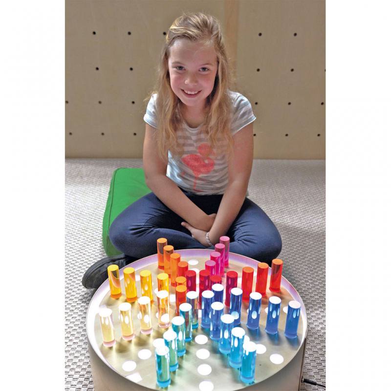 Die transparenten Acrylzylinder laden zum freien Experimentieren ein: Sie können nach Farben geordnet, zu Türmen gestapelt oder in fantasievolle Muster gelegt werden. Besonders auf einer Lichtquelle entfalten sie ihre volle Wirkung, wenn die transluzenten Farben eindrucksvolle Lichtspiele erzeugen. Dabei werden spielerisch das räumliche Denken, die Feinmotorik und die sensorische Wahrnehmung gefördert. Gleichzeitig lernen Kinder, Farben und Größen zu unterscheiden und eigene kreative Lösungen zu entwickeln. So entsteht mit den Acrylzylindern ein vielseitiges Spielmaterial, das zum Entdecken, Ausprobieren und Staunen einlädt.