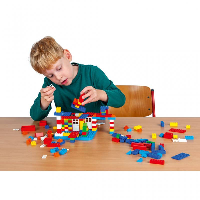 Im Set enthalten sind 250 Teile, darunter vielfältige Bausteine in bunten Farben sowie Bauelemente wie Fenster und Türen. Die praktischen Aufbewahrungseimer ermöglichen ein einfaches Verstauen nach dem Spielen – ganz ohne Chaos.