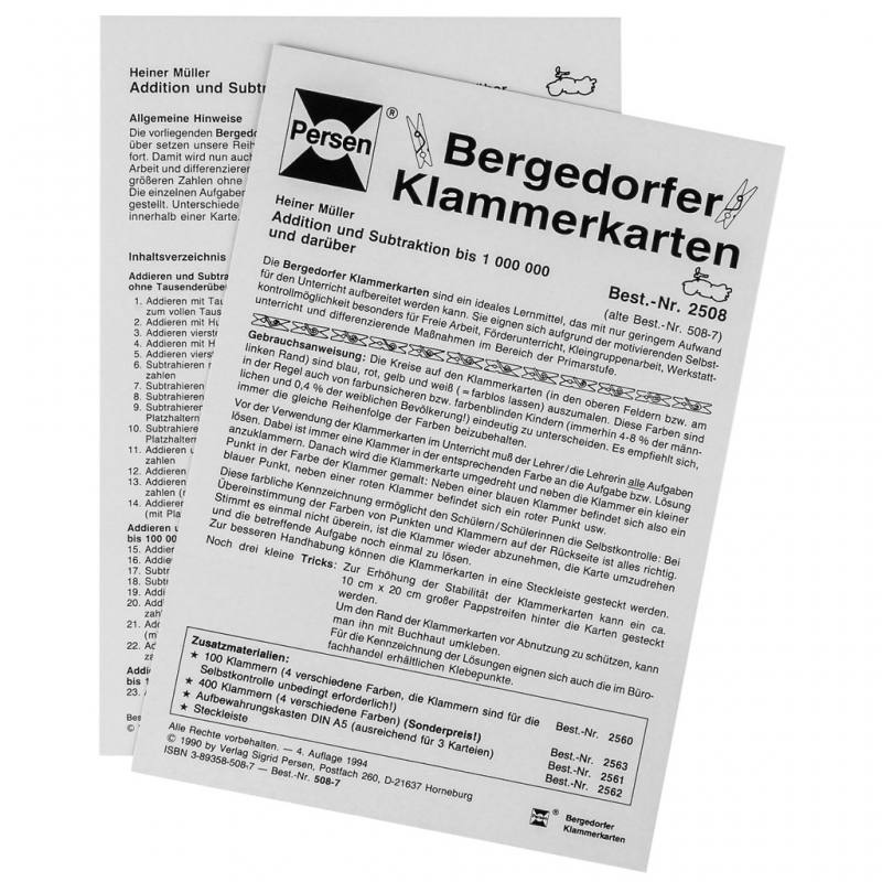 Die Bergedorfer Klammerkarten Addition und Subtraktion bis 1 Mio. im DIN-A5-Format sind Teil der bewährten Bergedorfer®-Reihe und verfügen über eine integrierte Selbstkontrolle. Die Kinder markieren ihre Antworten mit farbigen Klammern und überprüfen die Richtigkeit durch einfaches Umdrehen der Karte. So wird eigenständiges Arbeiten möglich und direktes Feedback sorgt für zusätzliche Motivation.