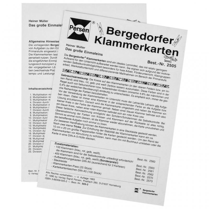 Die Karten der Bergedorfer Klammerkarten Das große Einmaleins im DIN-A5-Format sind Teil der bewährten Bergedorfer® -Reihe und verfügen über eine integrierte Selbstkontrolle. Die Kinder wählen ihre Lösung mithilfe farbiger Klammern und überprüfen diese durch Umdrehen der Karte. So erhalten sie direktes Feedback und arbeiten eigenständig und motiviert.