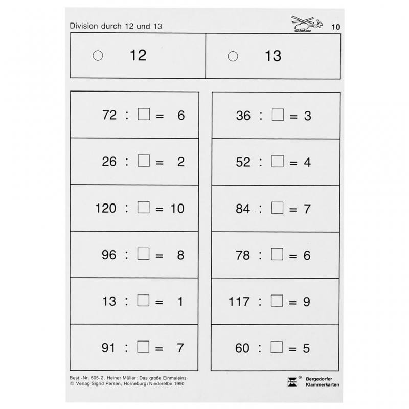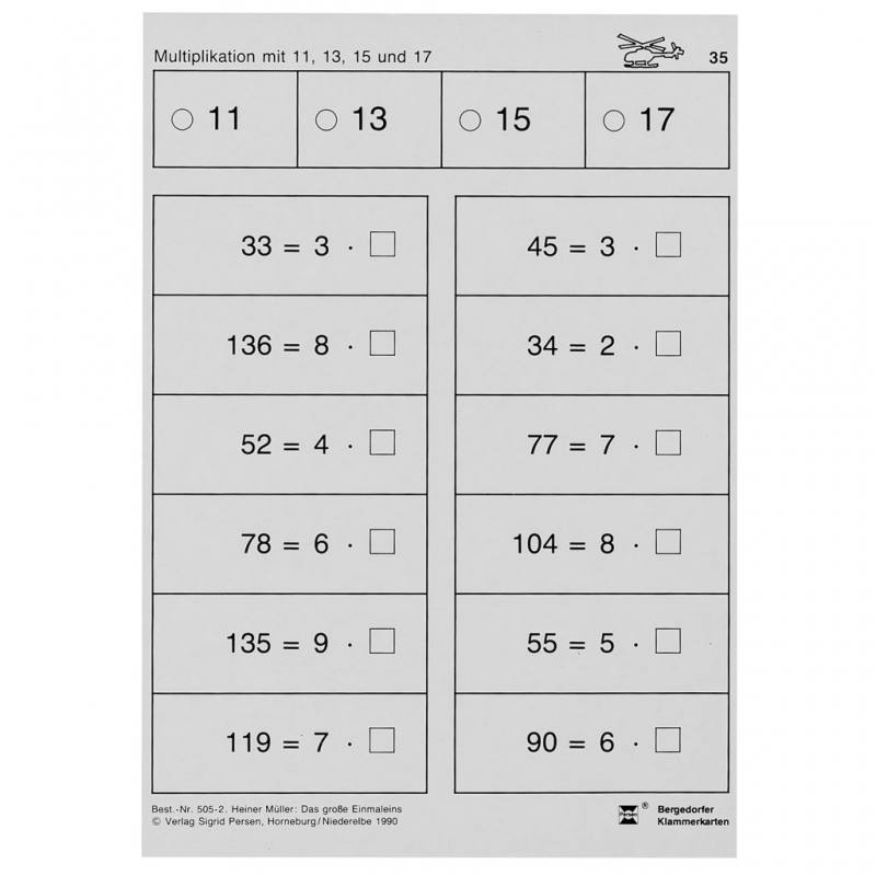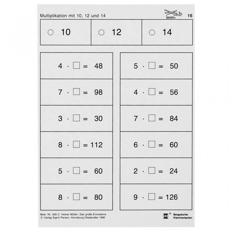 Die 46 bedruckten Lernkarten der Bergedorfer Klammerkarten Das große Einmaleins helfen Schülerinnen und Schülern der 3. und 4. Klasse, das große Einmaleins sicher zu beherrschen. Mit Aufgaben zu den Einmaleins-Reihen von 10 bis 19 trainieren die Kinder gezielt ihre Multiplikationsfähigkeiten und bauen ihr mathematisches Grundwissen weiter aus.