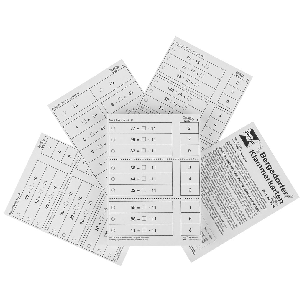 Ideal einsetzbar in Freiarbeit, Förderunterricht oder Gruppenphasen unterstützen die Bergedorfer Klammerkarten Das große Einmaleins das selbstständige Üben und Festigen der Malreihen. Ein durchdachtes Lernmaterial für nachhaltigen Lernerfolg im Umgang mit größeren Einmaleins-Aufgaben.