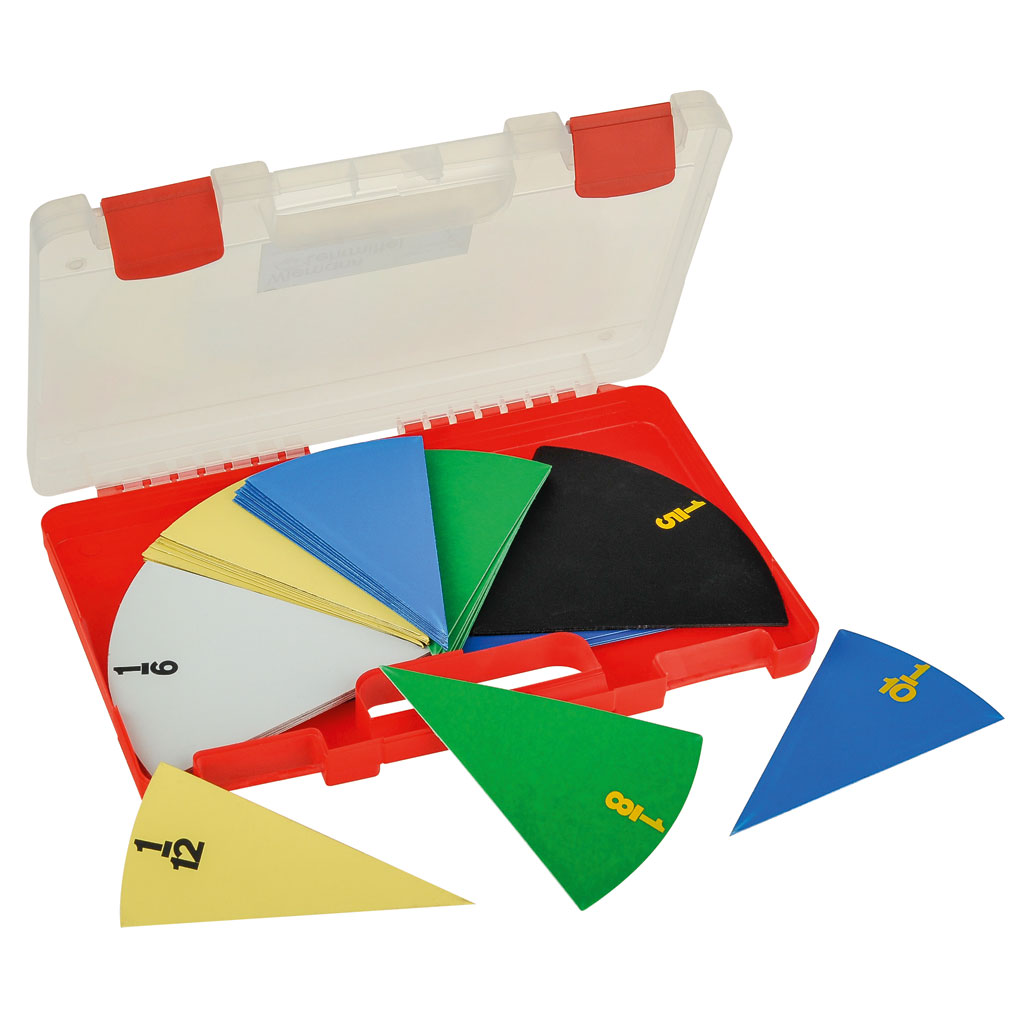 Der Bruchrechenkasten ist ein umfassendes Lernset zur Veranschaulichung und Festigung von Brüchen. Er enthält 52 Teile, die zusammen neun vollständige Kreisscheiben ergeben. Die verschiedenen Bruchteile ermöglichen die Darstellung von Ganzen, Hälften, Dritteln, Vierteln, Fünfteln, Sechsteln, Achteln, Zehnteln und Zwölfteln. Jeder Bruch ist in einer eigenen Farbe gehalten, was die Unterscheidung und das Lernen erleichtert.