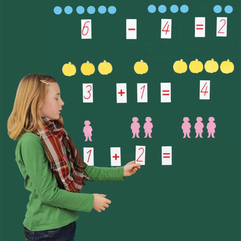 - 10 Stück Ziffern von 0 bis 9 sowie wichtige Rechenzeichen wie Plus, Minus, Gleich, Größer als und Kleiner als sowie