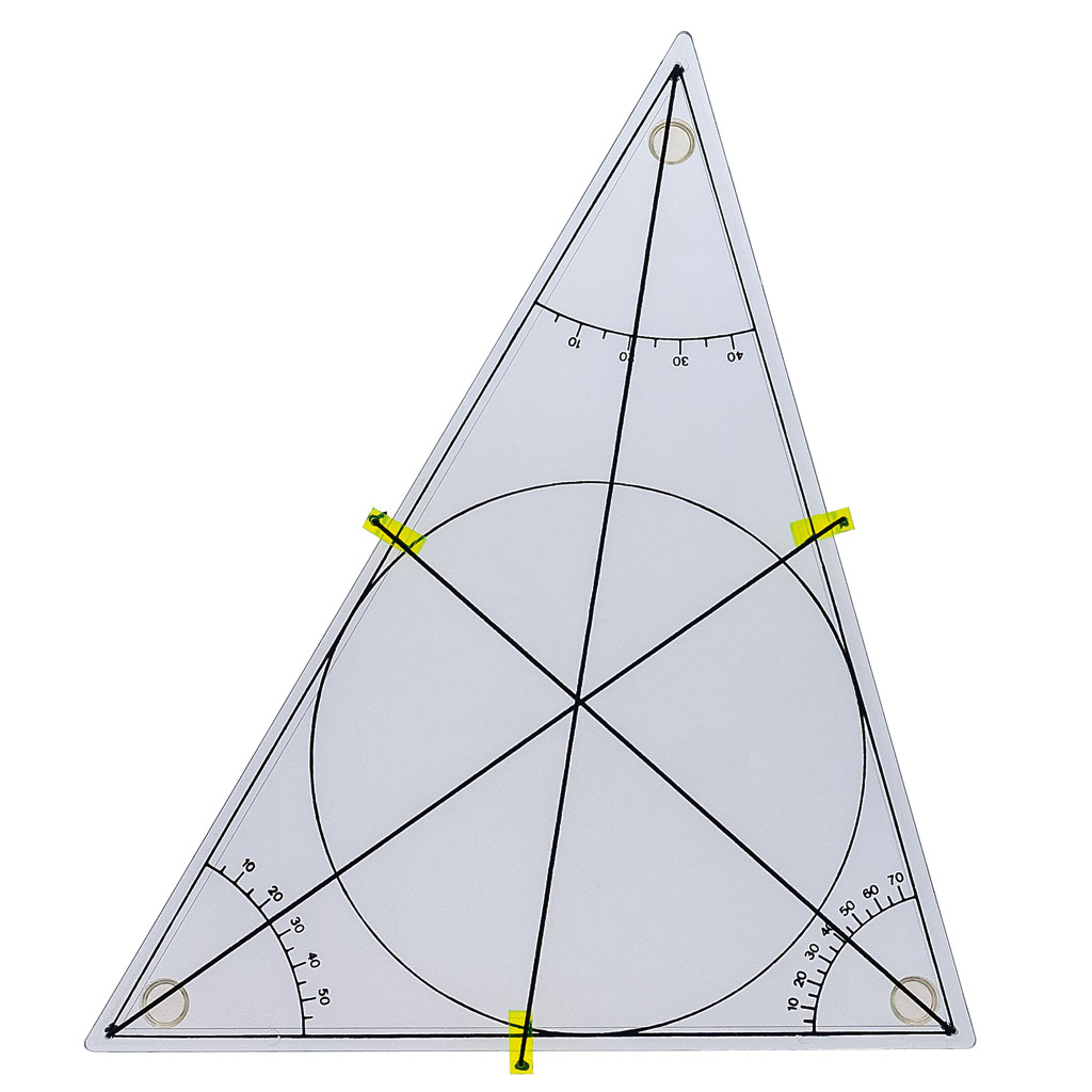 Die Besonderheit dieses Modells liegt in den flexiblen elastischen Schnüren. Diese ermöglichen eine dynamische Darstellung der Winkelhalbierenden zur Bestimmung des Inkreismittelpunkts sowie der Seitenhalbierenden zur Lokalisierung des Schwerpunkts. Die Schnüre lassen sich leicht anpassen und verschieben, wodurch die Auswirkungen von Veränderungen innerhalb der Dreiecksstruktur sofort visuell nachvollziehbar werden. So wird die sonst statische Geometrie zu einem beweglichen und spannenden Forschungsfeld.