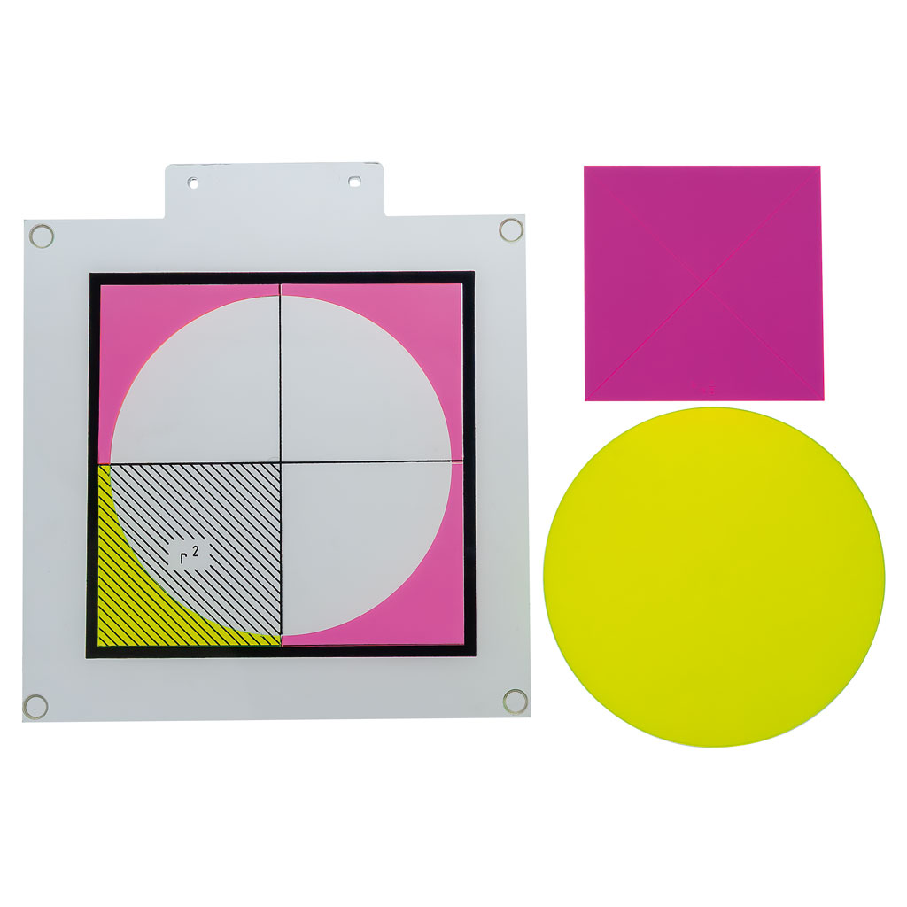 Das Modell zeigt eine schraffierte Fläche sowie ein Quadrat, das innerhalb des Kreises platziert ist. Diese Kombination ermöglicht es, den Schülern die Beziehung zwischen Radius des Kreises und seiner Fläche klar zu demonstrieren. Das schraffierte Segment stellt die Fläche r² dar und verdeutlicht, wie die Fläche des Kreises in Bezug zum Quadrat innerhalb des Kreises steht.