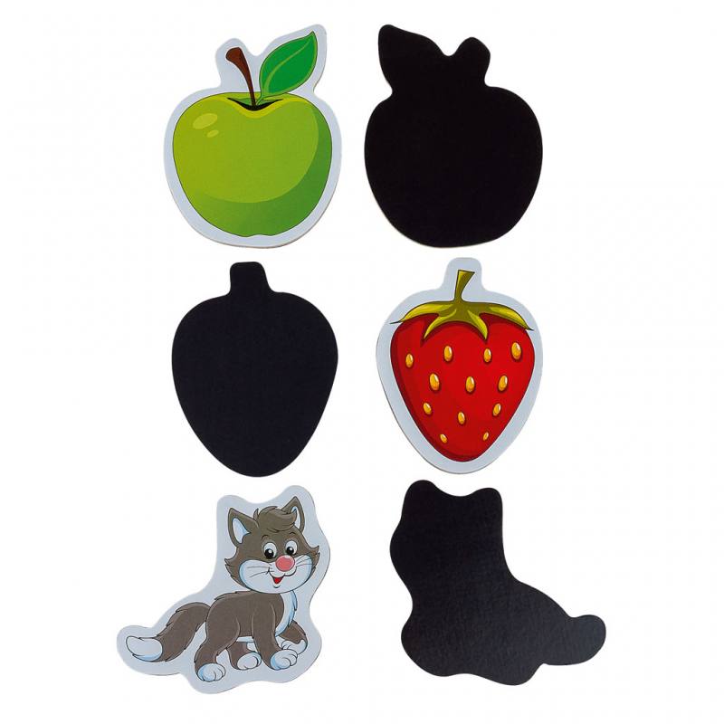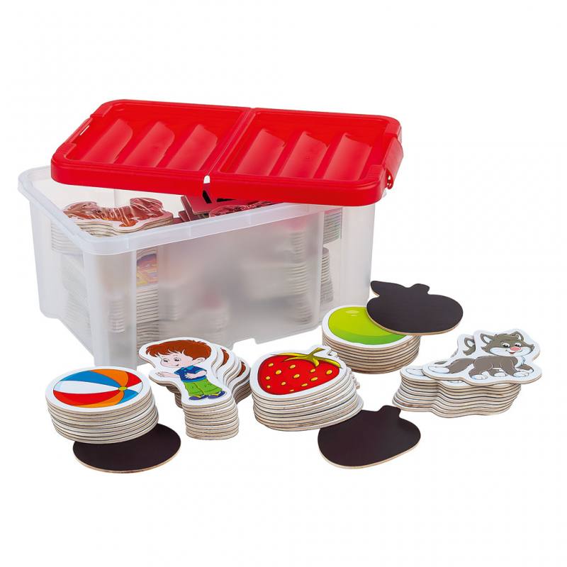 - 140 farbenfrohe Magnetbilder mit je 10 Motiven von Äpfeln, Erdbeeren, Karotten, Eis, Hunden, Katzen, Kühen, Autos, Fahrrädern, Hubschraubern, Häusern, Bällen, Mädchen und Jungen,
