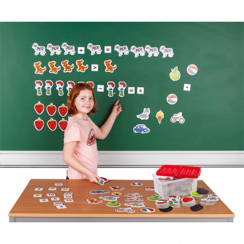 Entdecken Sie die faszinierende Welt der Zahlen und Mengen und vermitteln die die Grundlagen im Zählen und Rechnen mit unserem magnetischen Lernspiel Bildhafte Mathematik. Das umfangreiche Set enthält insgesamt 196 magnetische Bilder, Zahlen und Rechenzeichen und ist perfekt für den Einsatz im Klassenzimmer der Grund- und Vorschule geeignet.