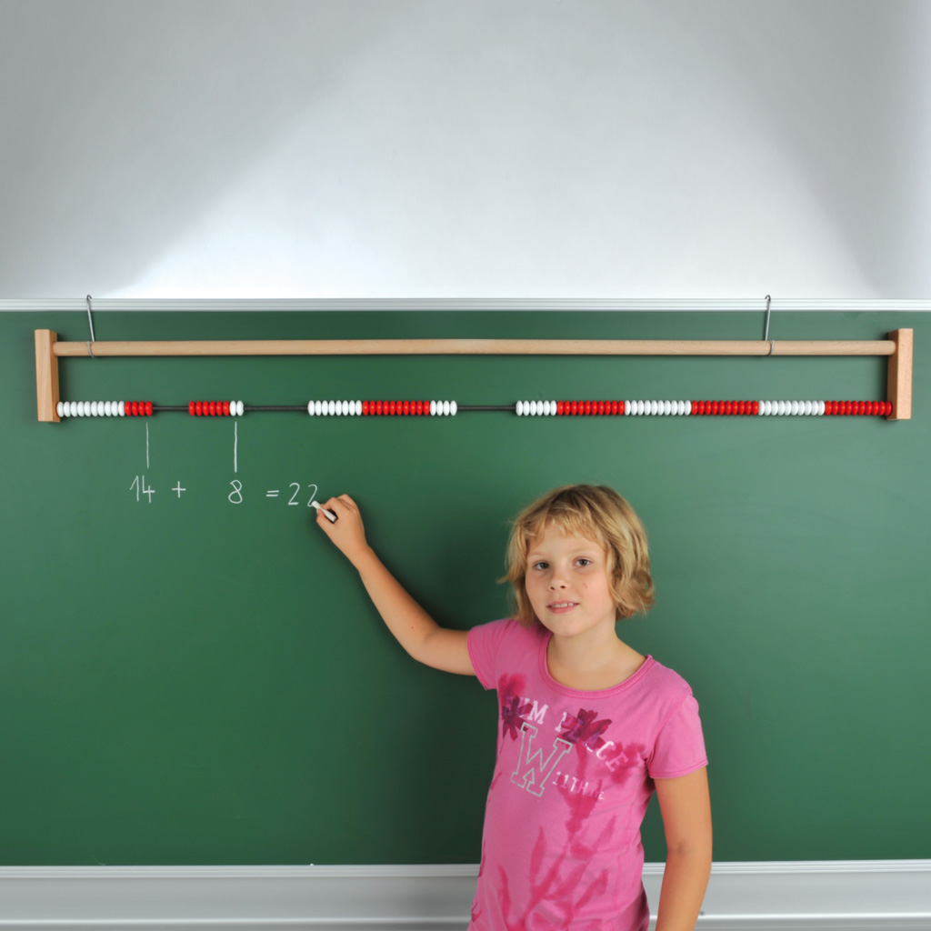 Rechengerät bestehend aus 100 Kunststofflinsen je 10 Stück im Wechsel (rot und weiß) mit Anhängebügel für die Stahltafel.