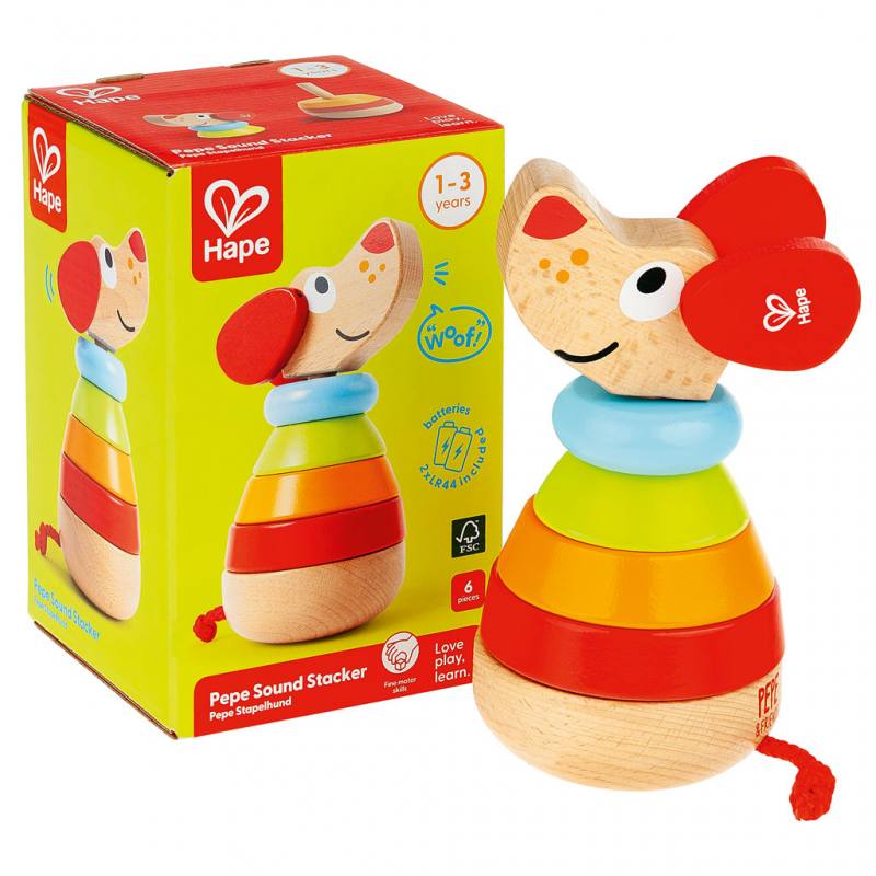 Der integrierte Geräuscheffekt macht das Spielerlebnis besonders lebendig: Bei jeder Berührung am Kopf reagiert Stapelhund Pepe mit einem niedlichen Bellen, wodurch zusätzlich das Gehör und die Aufmerksamkeit der Kinder geschult werden. Gleichzeitig werden Feinmotorik und Auge-Hand-Koordination gefördert, wenn die Teile gezielt platziert werden müssen.