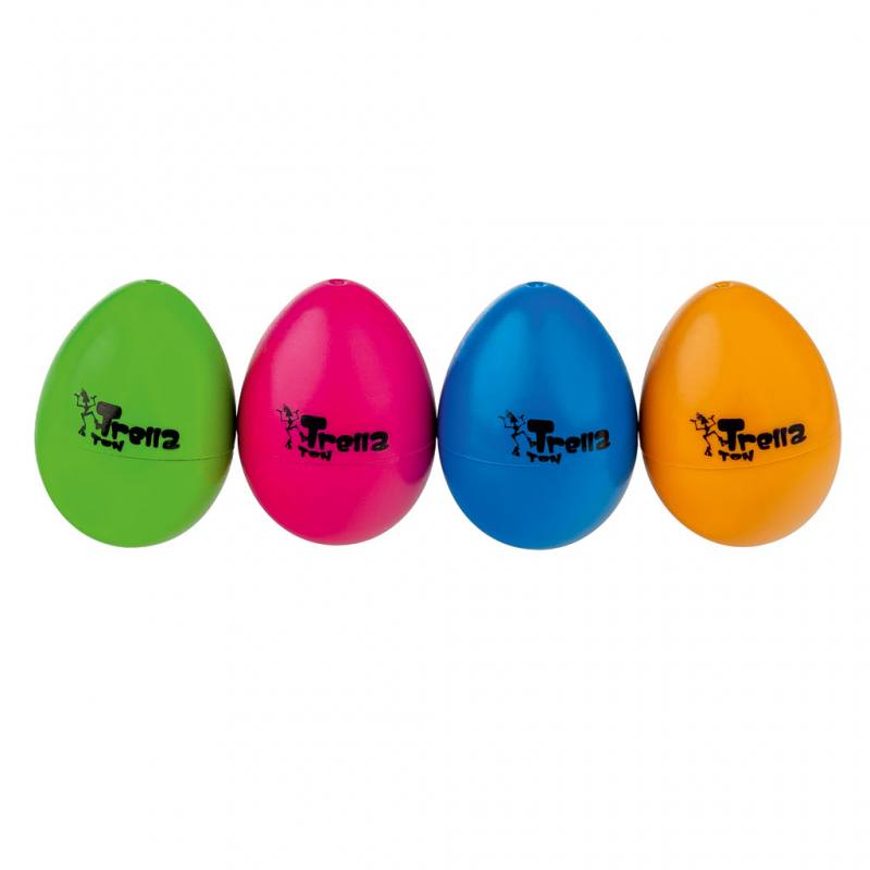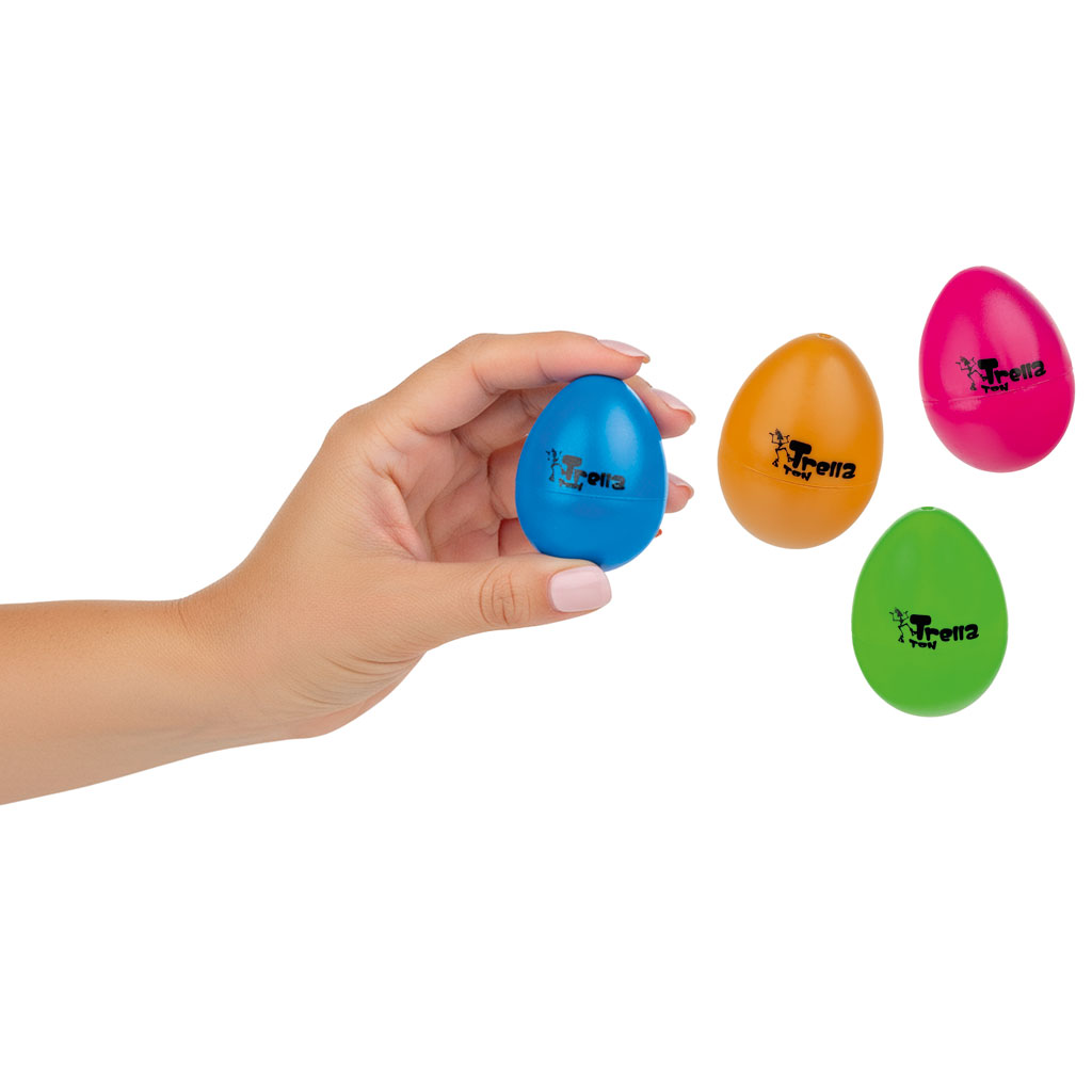 Das Set umfasst 4 eiförmige Chicken Shake Schütteleier mit einem Durchmesser von 4 cm und einer Höhe von 5,5 cm. Jede Mini-Maraca ist in einer der fröhlichen Farben Gelb, Pink, Blau und Grün gehalten und erzeugt einen charakteristischen Klang.