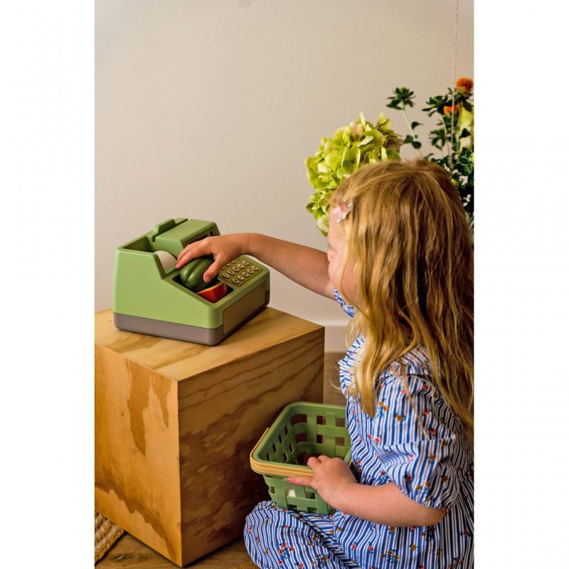 Die Kaufladenkasse ist mit einem solarbetriebenen Taschenrechner ausgestattet, der ohne Batterien auskommt und das Rechnen im Spiel erleichtert. So lernen Kinder, Zahlen zu verstehen und einfache Rechenaufgaben zu lösen, während sie in ihre Fantasiewelt eintauchen. Das Kassenregister ist robust gefertigt, liegt gut in kleinen Händen und fördert zugleich die Feinmotorik, soziale Interaktion und das Selbstvertrauen. Mit dem kleinen Körbchen einkaufen gehen und Lebensmittel wie Croissants, Paprika, Käse oder ein Ei hineinlegen und an der Kasse bezahlen.