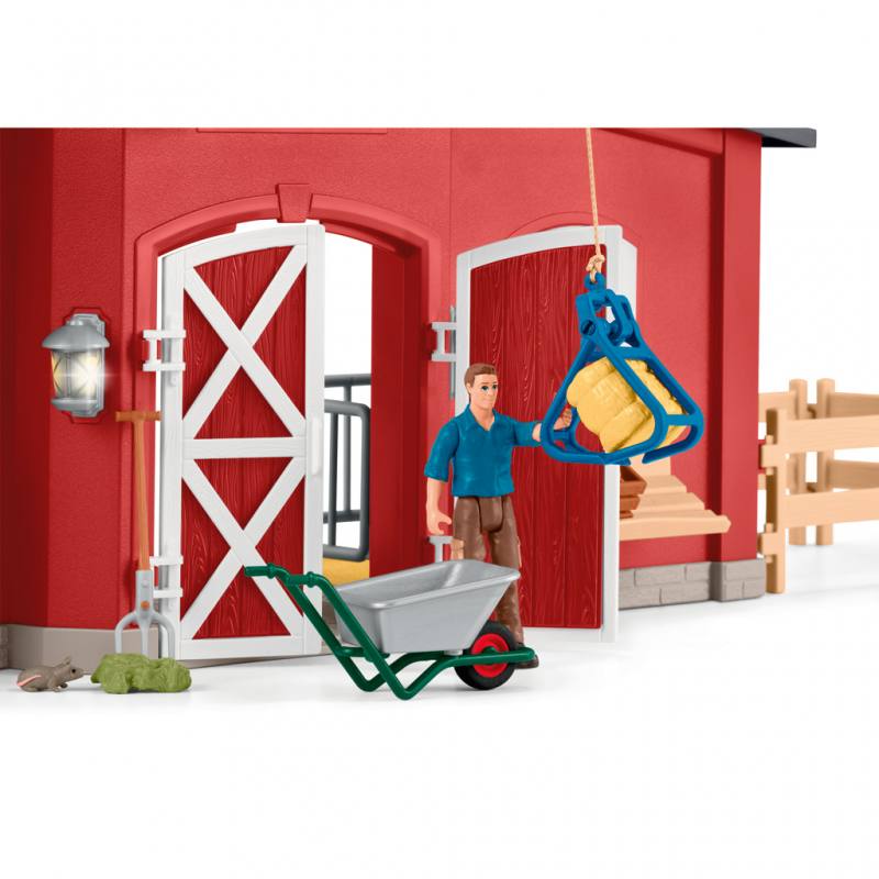 Das umfangreiche Zubehör wie Futterkarussell, Zaunelemente, Blumenkästen, Heugabel und Schubkarre sorgt für noch mehr Spielmöglichkeiten. Das Heu lässt sich aufspießen und mit der Heugabel in die Schubkarre legen. So lernen Kinder spielerisch Verantwortung und Abläufe auf einem echten Bauernhof kennen.