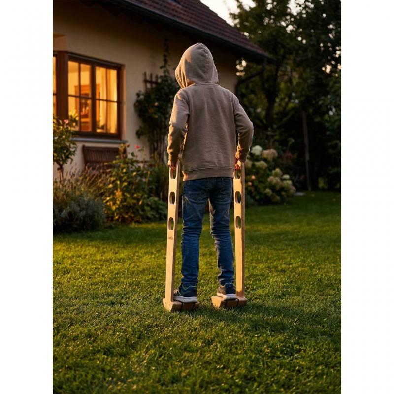 Mit nur 1,4 Kilogramm Gewicht sind die Kinderstelzen angenehm leicht, gleichzeitig jedoch äußerst stabil und wertig verarbeitet. Der Einsatz nachhaltiger, heimischer Hölzer sorgt zudem für ein natürliches Produkt, das sowohl sicher als auch umweltbewusst ist. Ob erste Schritte oder kleine Wettläufe, die Kinderstelzen fördern Gleichgewicht und Körpergefühl und verwandeln jeden Bewegungsbereich in eine kleine Abenteuerlandschaft.