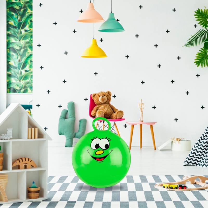 Der Hüpfball mit lachendem Gesicht sorgt für jede Menge Spielspaß und bringt Kinder in Bewegung. Mit seinem fröhlichen Design und den großen Augen ist er ein echter Hingucker. Ob drinnen im Kinderzimmer oder draußen im Garten – Kinder ab drei Jahren können nach Herzenslust hüpfen und dabei spielerisch ihren Gleichgewichtssinn und die Muskulatur stärken.