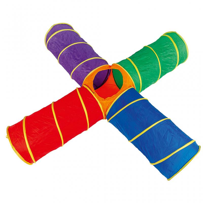 Der bunte Krabbeltunnel mit vier Ausgängen lädt Kinder zum Entdecken, Krabbeln und Verstecken ein. Mit seinen farbenfrohen, runden Tunneln bietet er viel Platz für spannende Abenteuer und fördert spielerisch die Motorik sowie die Bewegungsfreude.
