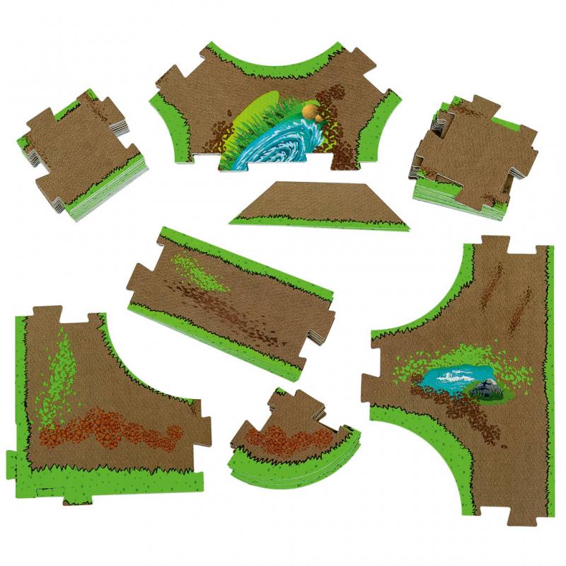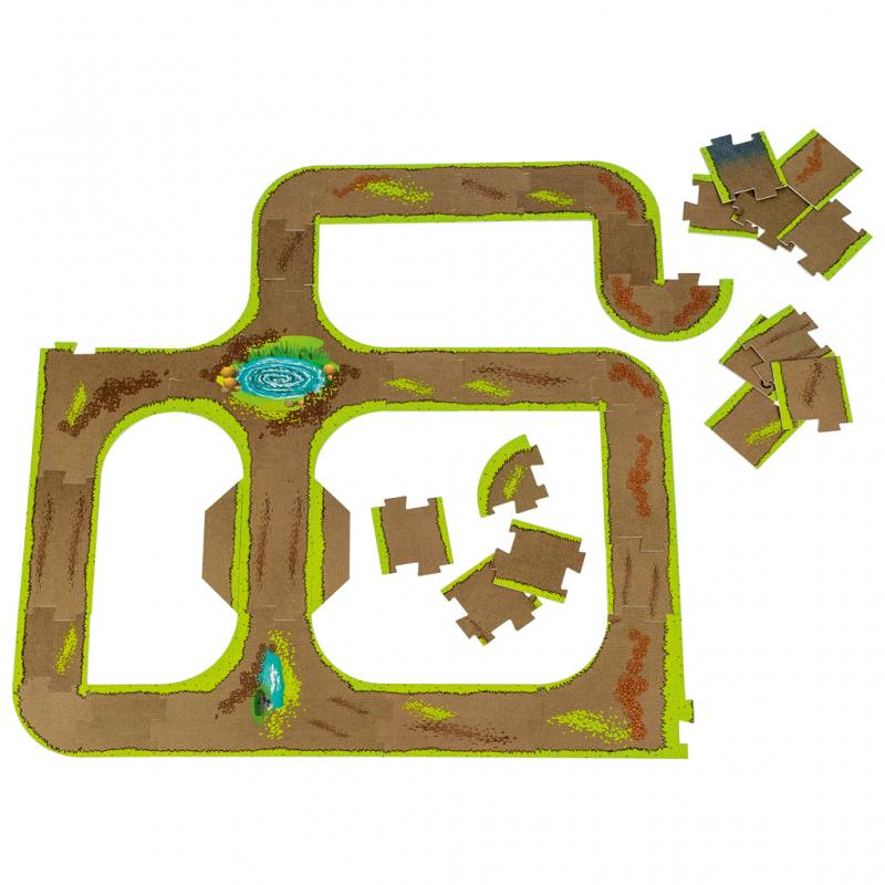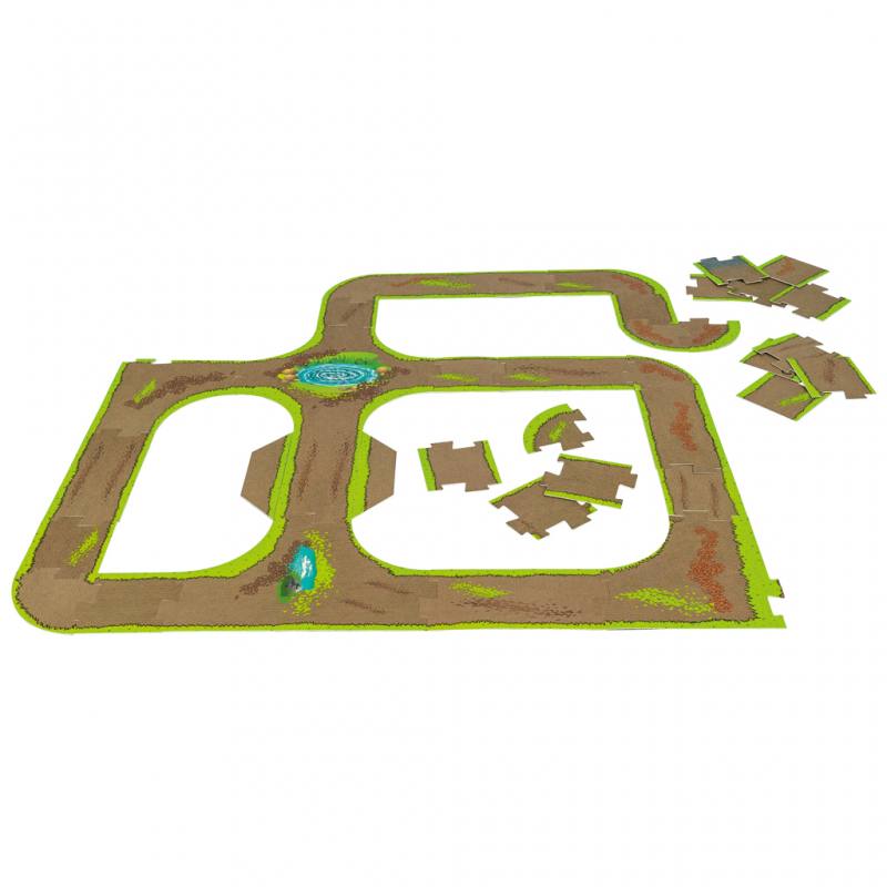 Der Bausatz besteht aus 44 Teilen, darunter Geraden, Kurven und sogar einen Kreisverkehr. Die Kinder können damit verschiedene Straßen bauen und gestalten. Mit einer Straßenbreite von 15 cm haben die Spielzeugfahrzeuge jede Menge Platz. Die Straßen sehen aus wie echte Feldwege und unbefestigte Straßen, was das Spiel noch realistischer macht.