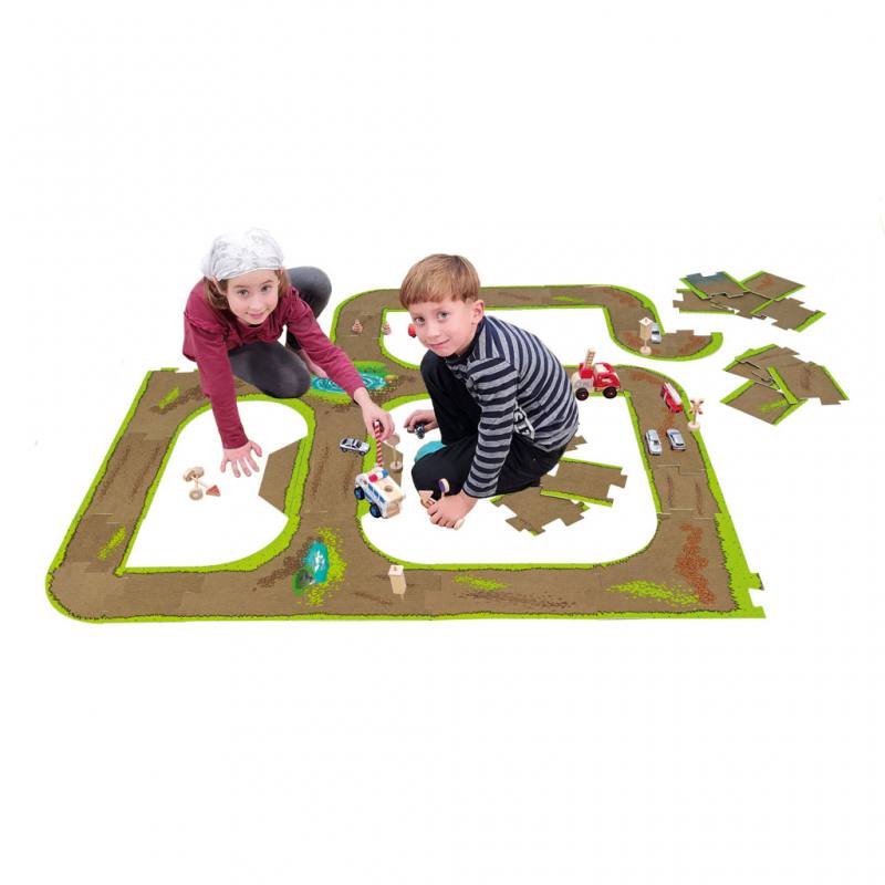 Die Unterseite des Straßenteppichs besteht aus rutschfestem Latex. Die Bauteile lassen sich kinderleicht wie Puzzleteile zusammensetzen, sodass die Kinder sofort loslegen könnt. Und das Beste ist: Die Kinder könnt den Straßenbausatz mit anderen Sets kombinieren und so ihre Spielwelt immer weiter wachsen lassen.