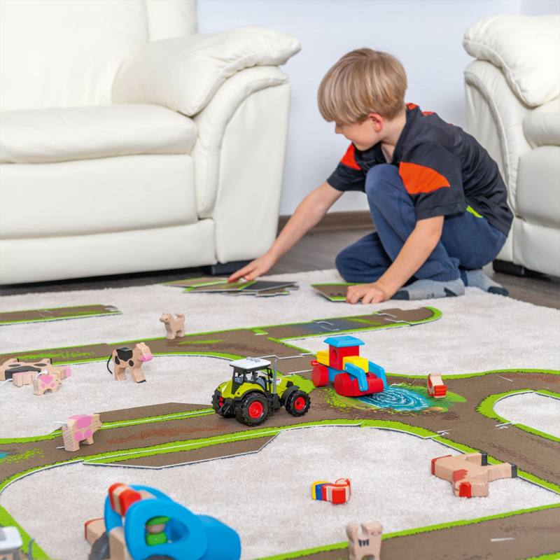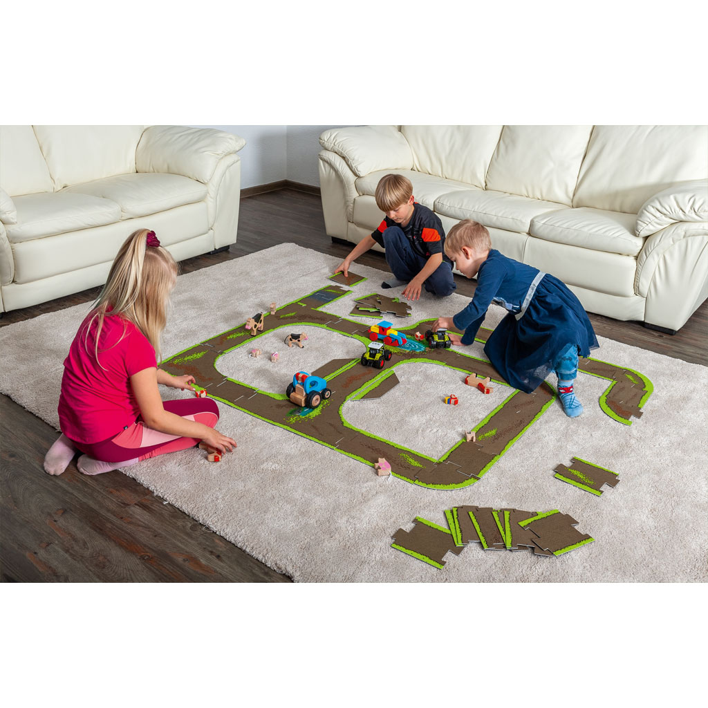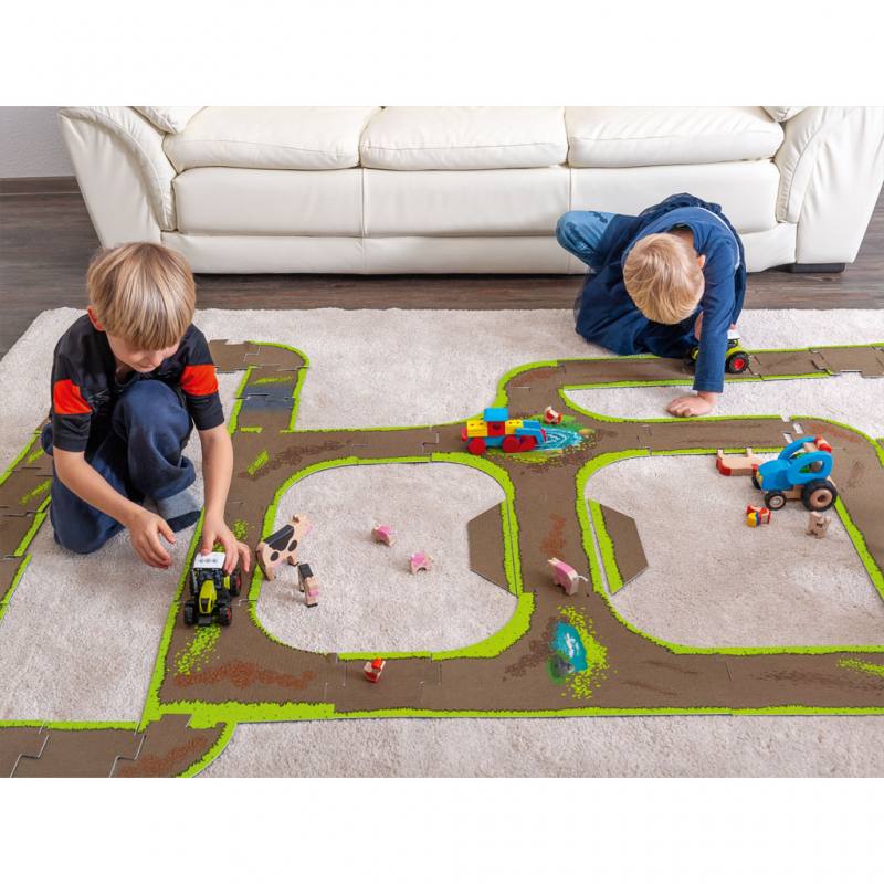 Entdecken Sie gemeinsam mit Ihren Kinder das Landleben mit unserem tollen Straßenbausatz Landwirtschaft! Dieser einzigartige Straßenteppich zum Zusammenstecken bringt die Abenteuer unbefestigter Straßen und Feldwege direkt ins Spielzimmer oder nach Hause.